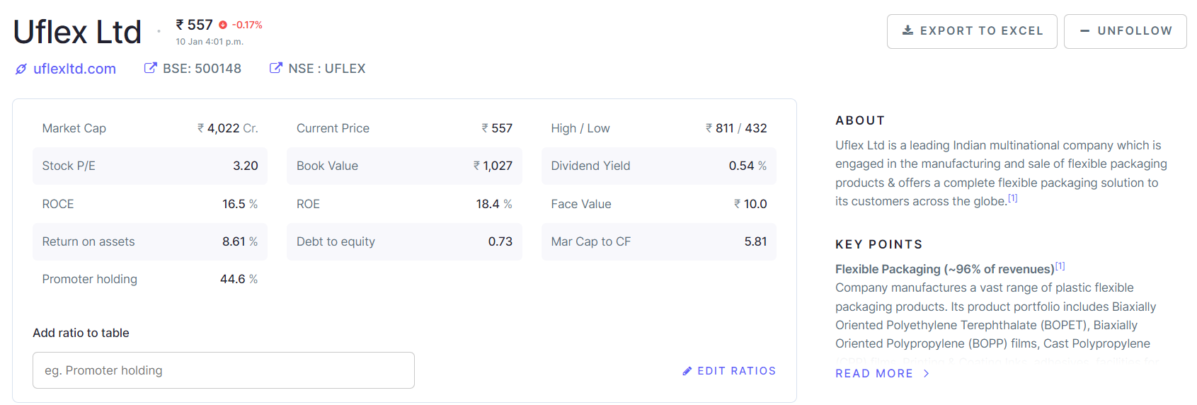 The name of the company thus shortlisted is Uflex Limited. Now, for this article, I will not be going into an analysis of Uflex, but will rather be highlighting its broad financial ratios and how I think they point towards it being a company that looks good (not financial /investment advice) for investment. A full analysis would of course be more strenuous with peer comparison, forecasting etc. But for those of us going by the "feel" of a company, this could be a great place to start.
